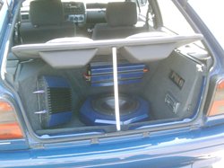 Radio mit 7" TFT im Armaturenbrett, 2 x 13er in den Türen, 2 x Emphaser in der selbstgebauter Kofferraumabdeckung, 1 x 30er Subwoofer von Radical Audio in sechseckiger MDF- Kiste die zu 2/3 in der Ersatzradmule versenkt ist |